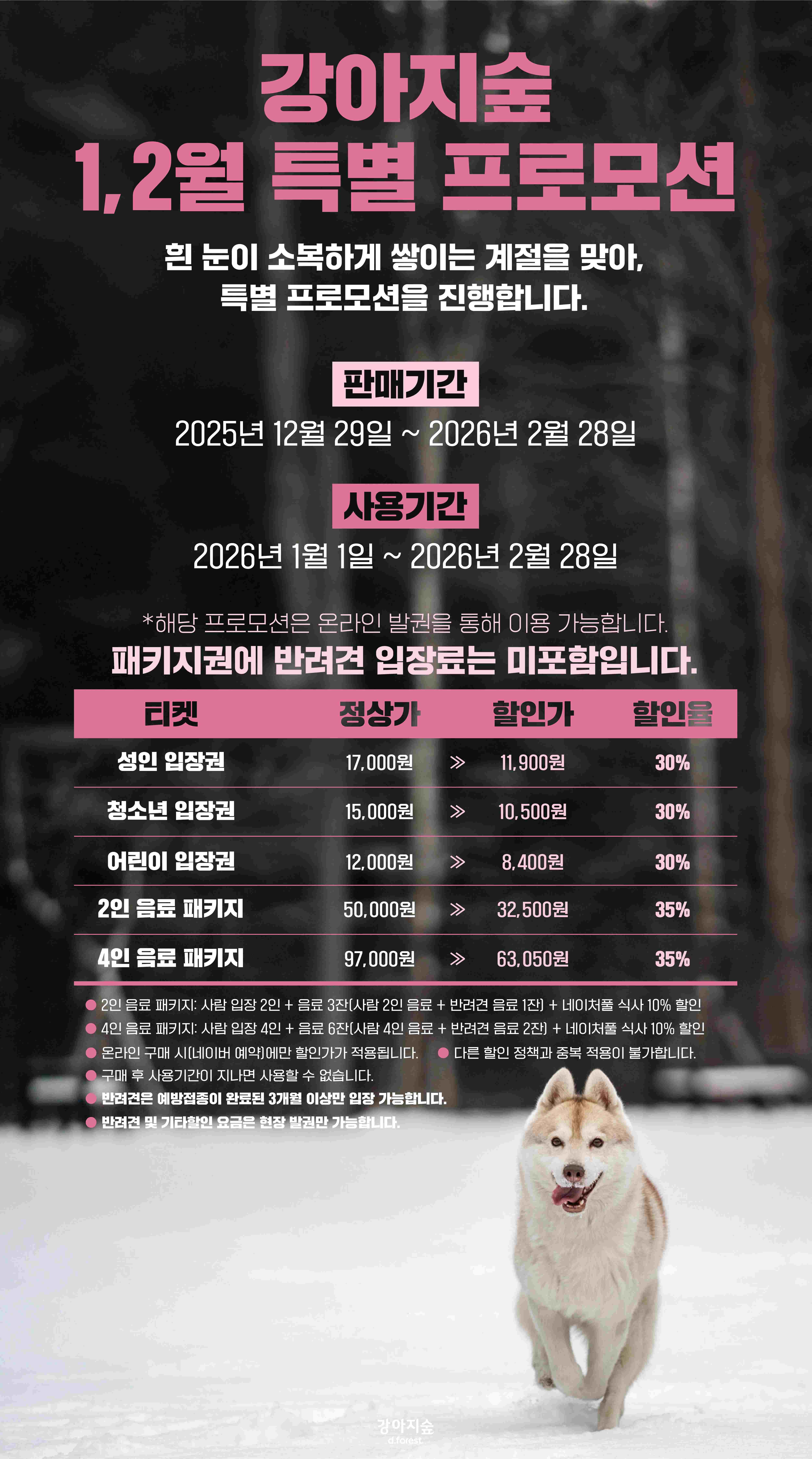 “설경 속에서 맞는 특별한 새해”…강아지숲, 1·2월 특별 프로모션 실시